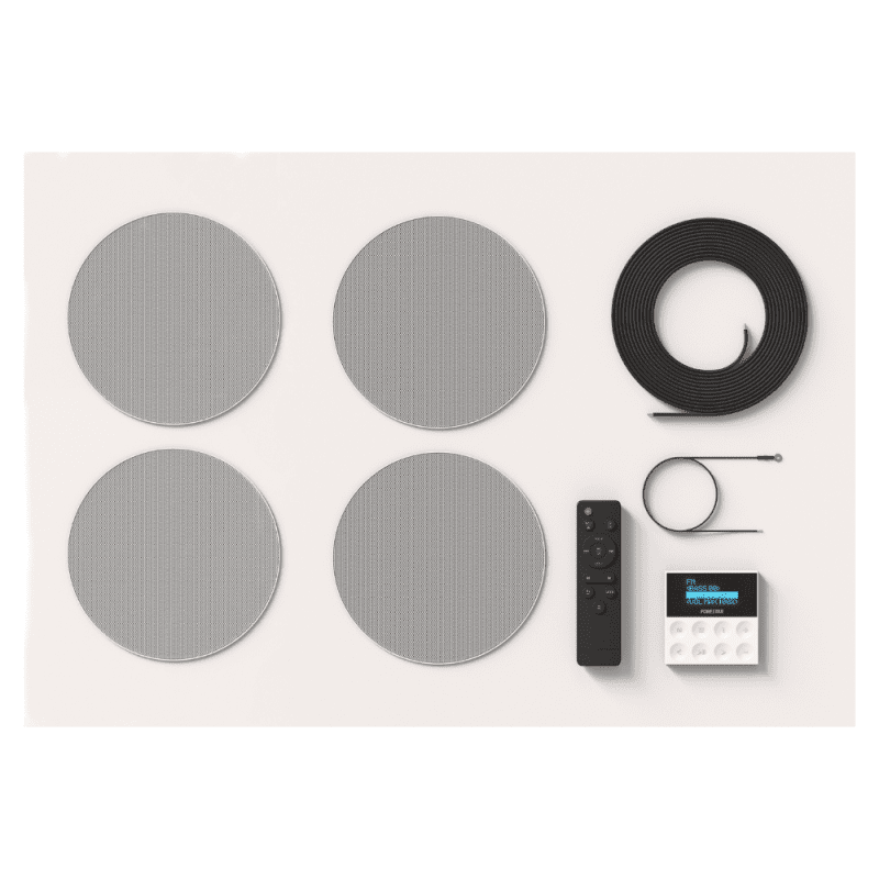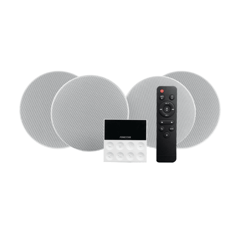 Kit de sonido (todo en uno) que incluye 4 altavoces de techo y amplificador de pared.