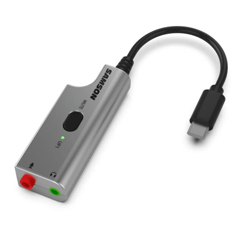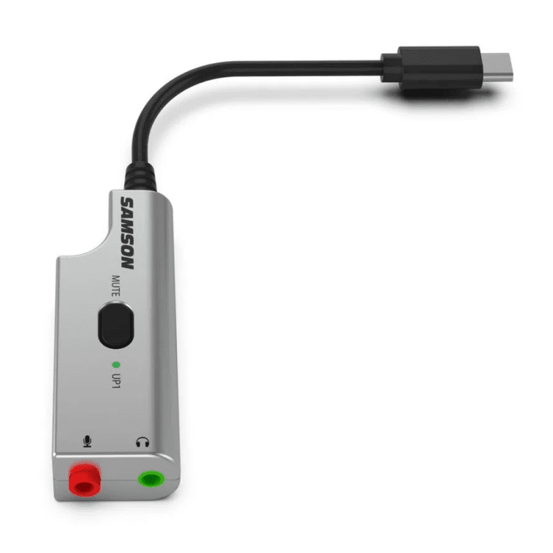 El UP1 es un adaptador de audio USB de analógico a digital con una entrada de micrófono de 1/8” (3,5 mm) y una salida de audífonos de 1/8” (3,5 mm). Cuenta con un conector USB tipo C e incluye un adaptador USB C a USB A para conectarse a cualquier computadora.