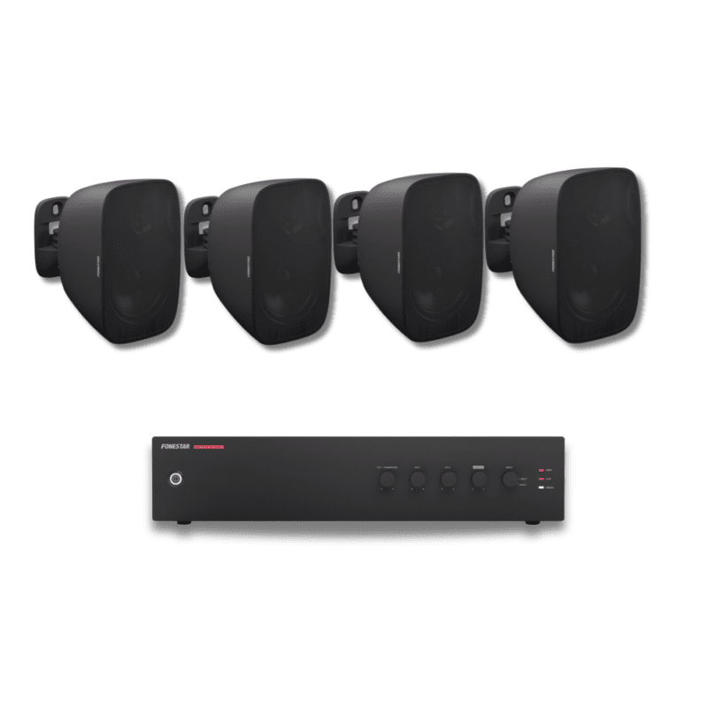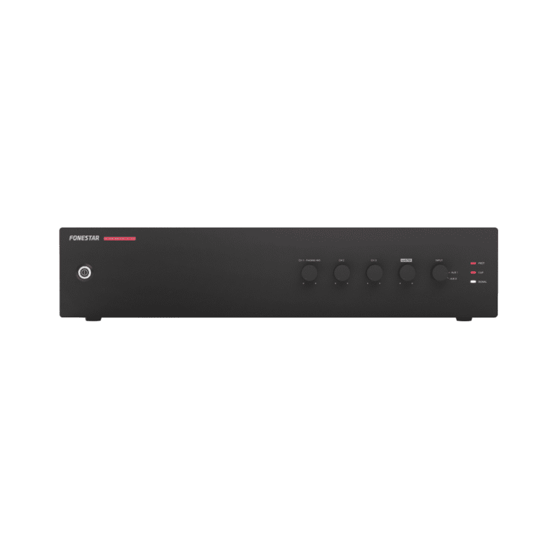 El amplificador Fonestar PROX-120S es el núcleo del sistema, proporcionando 120 W RMS de potencia para alimentar el parlante incluido y futuras ampliaciones. Está preparado para trabajar tanto en línea de 100 V como en baja impedancia.