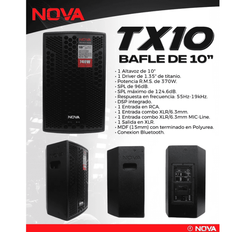 Gracias a su DSP integrado, el NOVA TX10 optimiza la respuesta sonora, logrando graves profundos y una reproducción precisa en todo el rango de frecuencias. La conectividad Bluetooth permite reproducir música de forma inalámbrica desde dispositivos compatibles, facilitando su uso en cualquier entorno.