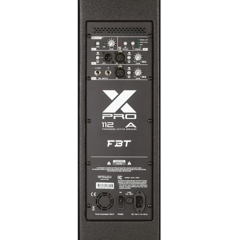 El panel de control cuenta con un mezclador de tres canales con dos entradas de microlínea, una entrada estéreo y un canal dedicado para bluetooth 5.0; dos entradas xlr, entrada estéreo, salida xlr con selector ch1 o mix link, filtro hp, dos selectores de línea de micrófono, selector de preset dsp, bluetooth 5.0 con led de emparejamiento. Los 4 puntos de suspensión M10 integrados en el gabinete junto con los soportes de montaje opcionales permiten que el parlante FBT XPRO 112A se monte en la superficie de paredes o techos.