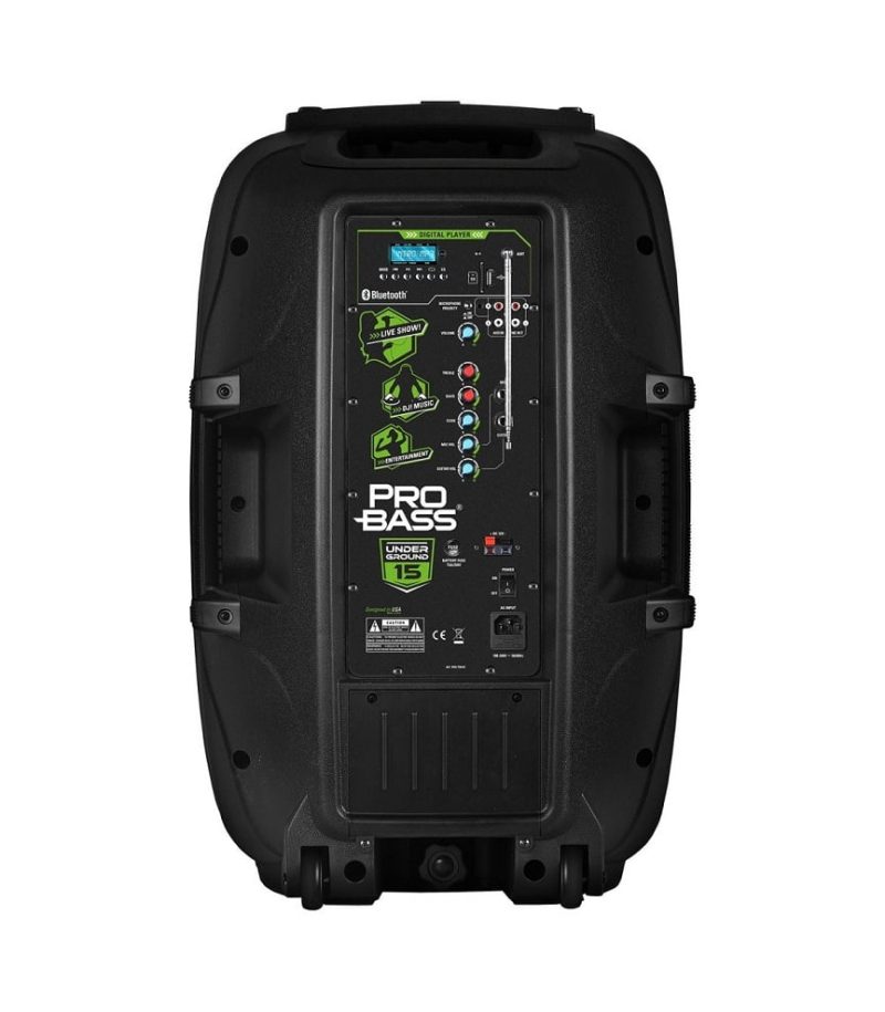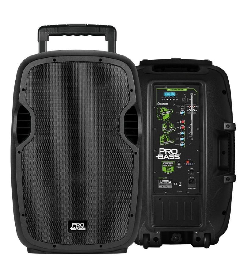 Diviértete en casa con tu familia o amigos con este excelente producto. EL Underground 15 de Probass es un parlante activo que entrega 100w rms y posee un woofer de 15 pulgadas. Este parlante está diseñado para que lleves la fiesta donde quieras ya que, posee una batería interna, manilla y ruedas para su fácil transporte. Cuenta con un puerto USB, SD y bluetooth para reproducir la música que más quieras desde un dispositivo móvil o Tablet.