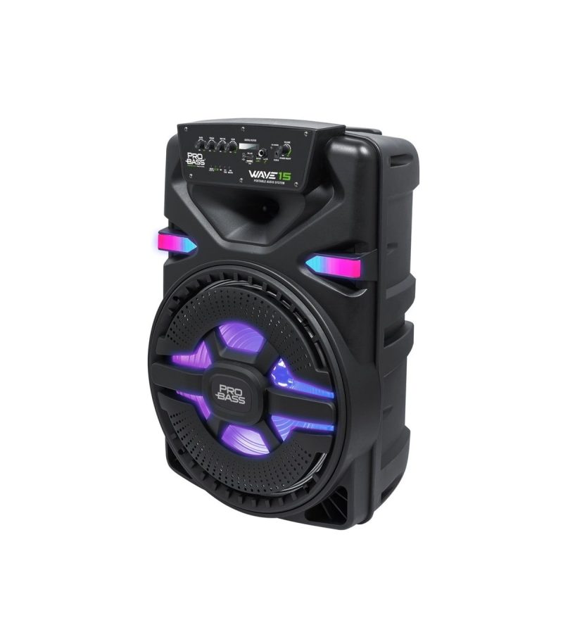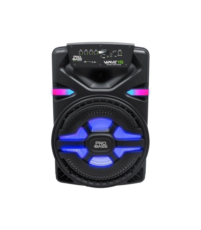 El Wave 15 de Probass es un parlantes portátil con batería interna que posee manillas y ruedas para su fácil transporte. Cuenta con luces led ultra brillantes, un woofer de 15 pulgadas, entrada USB, MicroSD y conexión vía bluetooth para reproducir la música que más quieras desde un dispositivo móvil o Tablet y armar la mejor fiesta en casa, además este parlante cuenta con tecnología TWS que permite conectarse a otro parlantes Wave 15 y tener un verdadero sonido estéreo (la funciona TWS solo está disponible cuando un dispositivo vía bluetooth esta conectado). Incluye un micrófono con cable.