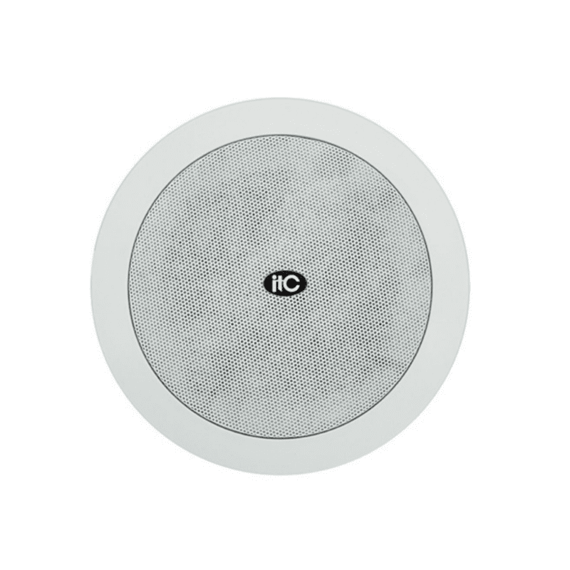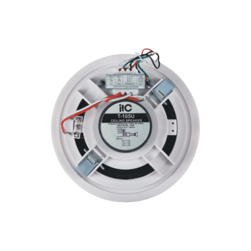 El ITC T-105U es un parlante de techo diseñado para sistemas de audio distribuido en línea de 100V, ideal para instalaciones comerciales que requieren una reproducción clara, uniforme y confiable.